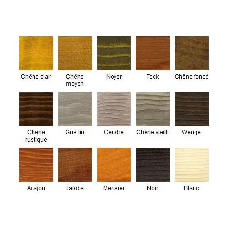 Existe en plusieurs teintes : chêne clair, chêne moyen, chêne foncé, chêne rustique, acajou, noyer, merisier, wengé et teck et en 5 couleurs : blanc, noir, gris lin, cendre et chêne vieilli.
